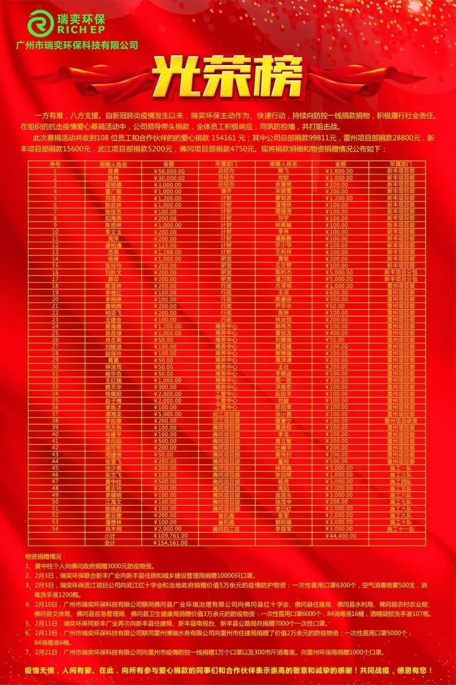 在陈勇董事长的带领下,瑞奕环保全体员工积极响应,各级领导率先垂范:陈勇董事长捐款5万元,陈伟总经理捐款3万元,公司总部各部门及各项目部领导平均捐款1500元以上。截止24日止,此次募捐共收到108 位员工和合作伙伴的的爱心捐款 154161 元。其中公司总部捐款99811元,雷州项目部捐款28800元,新丰项目部捐款15600元,武江项目部捐款5200元,佛冈项目部捐款4750元。此笔善款我们已经捐赠给中山大学教育发展基金会,定向用于中山大学附属第三医院驻湖北防疫工作组抗击新冠肺炎疫情。