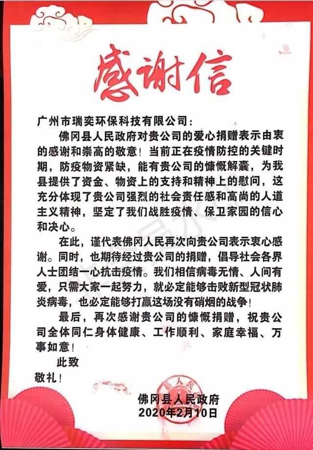2月10日上午,广州市瑞奕环保科技有限公司联同佛冈县广业环境治理有限公司向佛冈县红十字会、佛冈县住建局、佛冈县水利局、佛冈县农村农业局、佛冈县文体局、佛冈县应急管理局、佛冈县卫生健康局捐赠价值3万余元的防疫物资:一次性医用口罩6000个,84消毒液16桶,酒精凝胶洗手液107瓶。用实际行动体现了企业无私奉献的精神和敢于担当的社会责任感,与佛冈县人民携手共进,为抗击新型冠状病毒感染肺炎疫情贡献企业的一份力量。