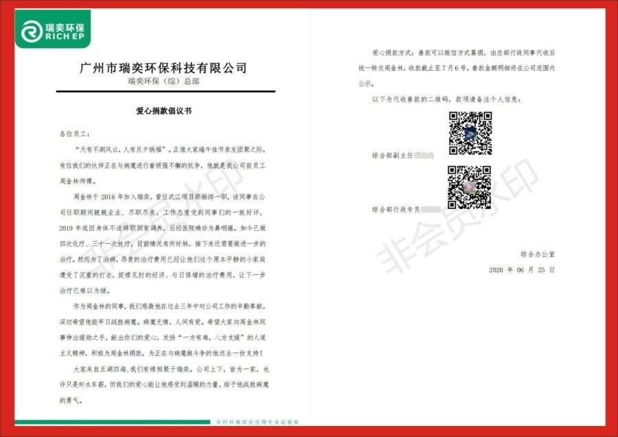 周金林师傅于 2016年加入瑞奕,2019年底因身体不适辞职回家调养,后经医院确诊为鼻咽癌。如今已做四次化疗、三十一次放疗。严峻的病情和昂贵的医药费,给本来平静的家庭带来了沉重的精神打击和巨大的经济负担。公司在得知此情况后,第一时间发出了捐款倡议,并得到了全体员工的积极响应。各级领导率先垂范、带头捐款,其中陈勇董事长带头捐款10000元,广大员工纷纷伸出援助之手,参与到本次爱心捐款活动中来。