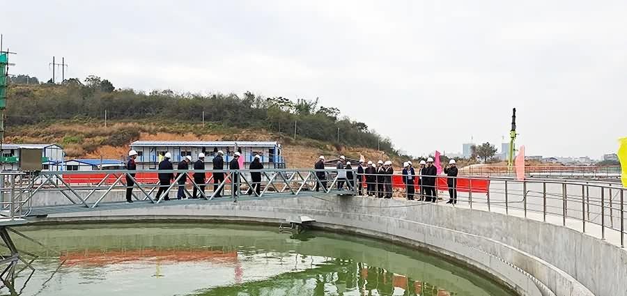 随后考察团一行参观了新丰第二污水厂在建项目。新丰第二污水厂是我省污染防治攻坚战的重点任务项目之一,项目于2020年9月10日正式开工,历时3个月完成池体主体结构和粗格栅、氧化沟、二沉池、高密度沉淀池、紫外消毒池、巴歇尔槽等机电设备安装,达到通水试运行条件。在时间紧、任务重的情况下,新丰项目团队狠发力、强推进,施工过程中加强统筹布局,优化施工资源配置,于昨日顺利举行通水仪式。