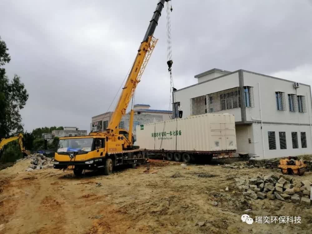 第一台瑞奕一体化污水处理设备在雷州项目现场紧张有序吊装!